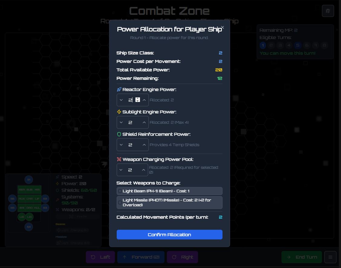 - Added movement buttons to control movement, a card to display movement/when a player can move. (Player can move on turns highlighted based on how much power they allocate to movement, resets every 8 turns at the start of a new round. Player can both move, and turn, or turn then move on each turn they are able to move)